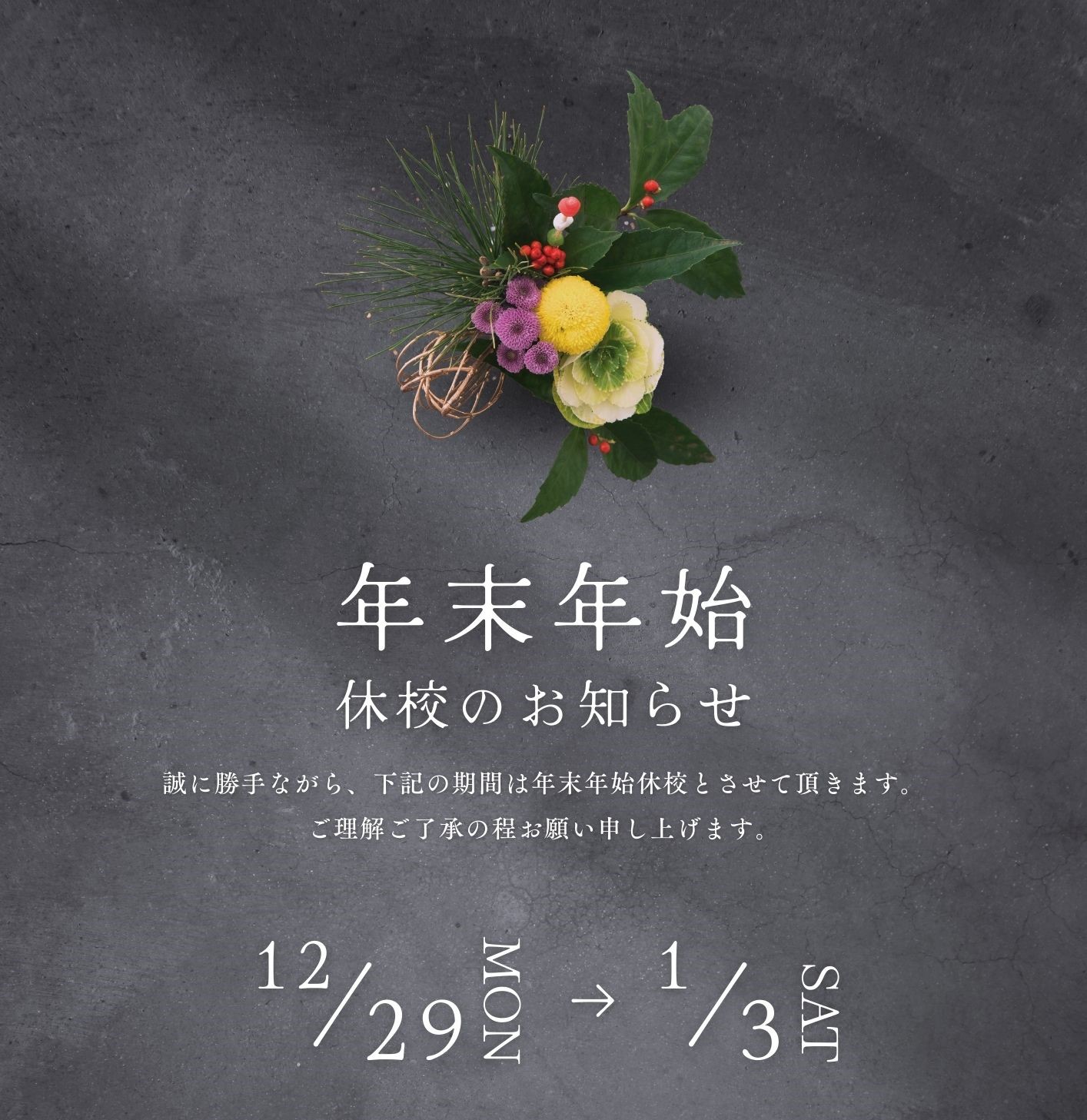 当校は上記期間を年末年始の休校日とさせていただきます。