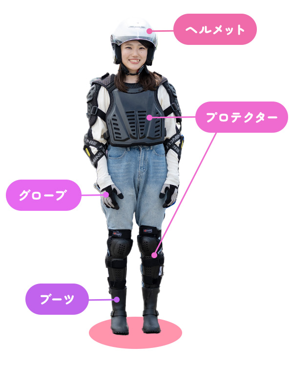 ※プロテクター(胸・肘・膝と脛)はバイク車庫に貸出用のものがあります。