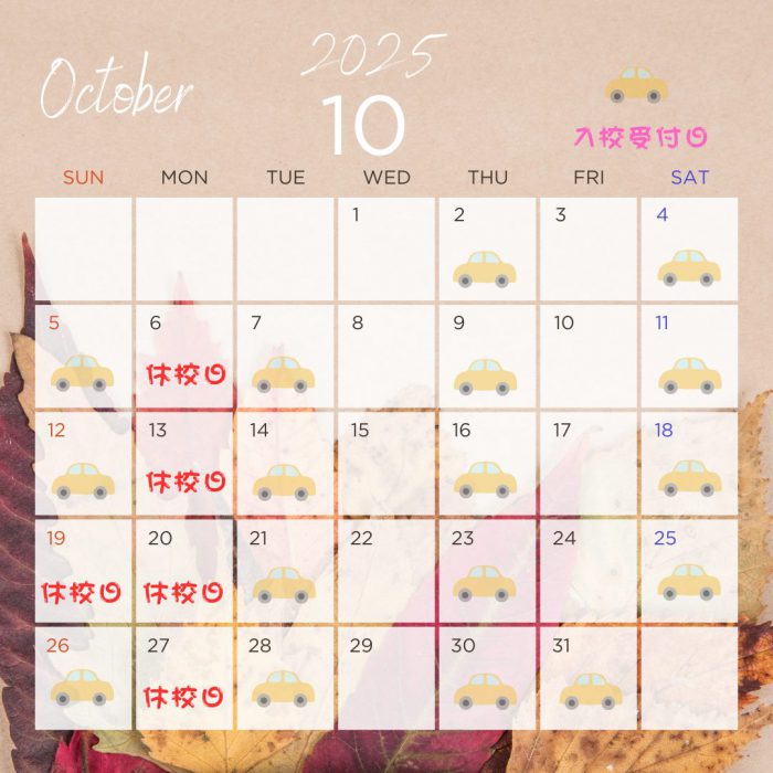 令和7年10月カレンダー 2025年9月25日 入校受付時刻は適性検査予約画面で確認いただくか、窓口までお問い合わせ下さい Facebook で共有するにはクリックしてください (新しいウィンドウで開きます)クリックして Twitter で共有 (新しいウィンドウで開きます)クリックして Line で共有 (新しいウィンドウで開きます)
